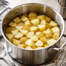 Preparation (parboil) — for crispiness: place the chopped potatoes in a large pot and cover them with cold water so that they are submerged by about 2 cm. Add 3 g of salt (about 3 pinches). Bring to a boil over high heat, then reduce the heat and cook for 7–9 minutes — until the outer edges start to soften, but the center is still firm (pierce a piece with a fork: the fork should go in with slight resistance). Drain in a colander.