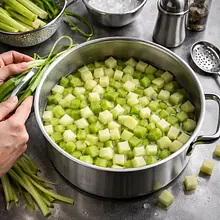 Peel the celery and cut it into even cubes about 2–3 cm. Cover the celery and potatoes with cold water in a pot so that the water covers them, add 2 g of salt (2 pinches) and bring to a boil. Cook over medium heat for 20–25 minutes until the pieces are soft (check with a fork — it should go in smoothly). Drain thoroughly, retaining a minimal amount of water. Place the hot vegetables back into the pot or a large bowl, add butter, and gradually pour in the warmed milk (heat it in a saucepan to a lukewarm temperature of 30–40°C). Use a potato masher or an immersion blender to blend into a smooth puree. Season with salt (use the remaining 2 g of salt) and freshly ground pepper to taste. The puree should be smooth, creamy, and slightly fluffy.