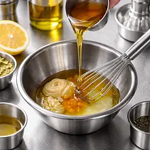 In a small bowl, combine honey (40 g), Dijon mustard (30 g), olive oil (30 g), lemon juice (30 ml), and finely chopped garlic (10 g). Whisk vigorously with a whisk or fork. Transfer the mixture to a small pan and heat over low heat for 1–2 minutes, stirring, until the glaze slightly reduces and becomes glossy. Do not boil vigorously — just reduce slightly to combine the flavors.