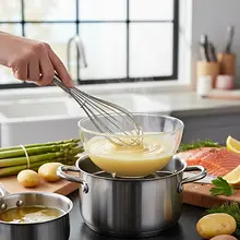Remove the bowl from the water bath. Now, while whisking vigorously, start adding the warm clarified butter. Pour it VERY SLOWLY, in a thin stream, almost drop by drop at first. Allow each portion of butter to fully combine with the yolk mixture before adding the next. When the sauce begins to thicken, you can pour the butter a bit faster. Continue until all the butter is used, and the sauce reaches the consistency of thin mayonnaise. Finally, season with salt to taste. Additionally, you can add a pinch of cayenne pepper for a gentle heat.