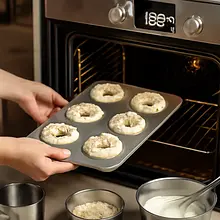 Place the tray with the shaped donuts in the preheated oven. Bake at 180°C (170°C for fan ovens) for 12–15 minutes. Rotate the tray halfway through the time if the oven bakes unevenly. The donuts are ready when the tops turn light golden, the edges are slightly browned, and a toothpick inserted in the center comes out dry or with a few moist crumbs (no raw dough). After baking, remove the tray and let the donuts sit on the paper for 3-4 minutes, then transfer to a rack to cool completely (at least 15-20 minutes).