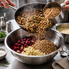 Preheat the oven to 200°C (top-bottom). Wash the beets under running water, cut off the leaves. Wrap each beet individually in aluminum foil tightly. Place on a baking sheet and bake for 60–75 minutes (depending on size) until a knife/skewer inserted in the center goes in smoothly - this is a sign that they are soft. After baking, set aside to cool slightly (10–15 minutes), then remove the foil and allow to cool completely so you can peel the skin off with your fingers or a knife. Cut into small cubes about 5–7 mm.