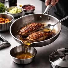 Turn the breasts to the meat side and fry for 1-2 minutes just to sear the surface. Transfer the pan to an oven preheated to 180°C or transfer the breasts to a baking tray and bake for 6-8 minutes for medium-rare doneness. Remove and set aside on a board, loosely cover with aluminum foil, and let rest for 8-10 minutes (during this time the internal temperature will equalize).