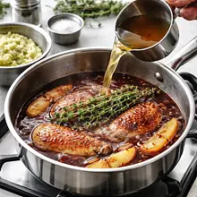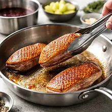 Remove the duck breast from the refrigerator 30 minutes before preparation to reach room temperature. Pat dry with a paper towel. Using a sharp knife, score the skin in a diamond pattern (diagonal cuts every 1 cm), being careful not to cut into the meat — just the skin and fat layer. Rub the skin and meat evenly with salt (about 1 g of salt per 100 g of meat) and freshly ground pepper. Set aside for 10 minutes.