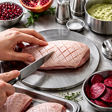 A modern, seasonal main dish that combines juicy, caramelized duck breast with an intense, slightly tangy pomegranate glaze and creamy celery puree. The dish is complemented by crispy beet chips and quickly pickled red onion, which add contrast in texture and color — the crimson pomegranate seeds act as "jewels," giving the plate a spectacular appearance. This dish is inspired by fusion cuisine: classic frying and roasting techniques are combined with fruit reduction and simple preservation methods, creating a refined, balanced flavor profile. Perfect to serve with roasted potatoes, seasonal green vegetables, or a light salad. The dish features contrast: the fatty, golden skin of the duck, the silky puree, and the crunchy beet element — it tastes exquisite and looks stunning on the plate.