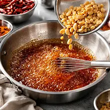 After evenly coating the nuts with caramel, turn off the heat. Immediately sprinkle the mixture with ground chili (5 g), smoked paprika (5 g), granulated garlic (5 g), black pepper (2 g), and salt (3 g). Stir vigorously for 30–45 seconds to distribute the spices throughout the caramel and nuts.