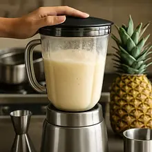 Blend on high speed for 30–45 seconds until the drink is smooth, creamy, and slightly frothy on the surface. Stop blending after 15 seconds and check the consistency; if there are larger pieces of ice or pineapple, blend for another 10–15 seconds.