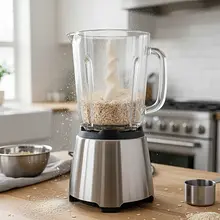 In a high-powered blender or coffee grinder, place the oats. Blend on high speed for about 30-60 seconds until you achieve a flour-like consistency. There may be small pieces of oats left, which will add an interesting texture to the pancakes.