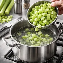 Peel the celery and cut it into even cubes (about 2–3 cm). Place the celery in a pot with cold, salted water (add 2 g of salt) so that it is covered, bring to a boil over medium heat, and then cook for 20–25 minutes until the pieces are completely soft (check with a fork — they should not resist). Drain thoroughly.