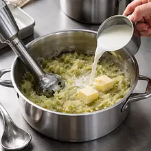 To the hot, drained celery, add 40 g of butter and 100 ml of milk. Blend with an immersion blender or in a food processor until smooth and creamy. If the puree is too thick, add 10 ml of milk at a time until you reach the consistency of a smooth cream. Season with 1 g of salt and 1 g of pepper to taste. The puree should be silky and hold its shape on the plate, but not be stiff.