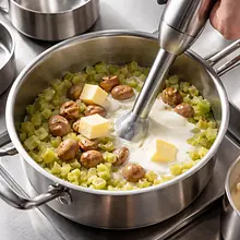 Add the cooked chestnuts, butter, and cream to the hot celery. Use an immersion blender or a stand blender and blend until smooth. If the mixture is too thick, gradually add the reserved cooking water from the celery or cream until you achieve a creamy, silky consistency. Season to taste with salt and a pinch of freshly ground pepper.