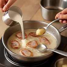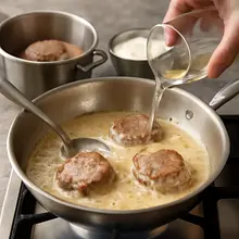 Take the tenderloin out of the fridge about 20-30 minutes before cooking to bring it to room temperature — this will ensure even frying. Clean the meat of membranes and excess fat: place the tenderloin on a cutting board, grab the silvery membrane (if present) and carefully slide a sharp knife underneath at an angle, so as not to remove too much meat. Then cut the tenderloin into 4 equal medallions about 3–3.5 cm thick (each ~150 g). Pat each medallion dry with a paper towel, then season evenly on both sides with salt (use about 1/2 teaspoon of salt per piece, totaling 6 g) and sprinkle with pepper (2 g).
