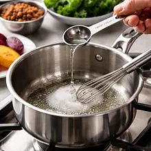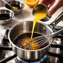 In a small skillet over medium heat, combine 30 g of honey, 60 ml of orange juice, 30 ml of balsamic vinegar, and finely chopped garlic clove (5 g). Heat while stirring with a wooden spoon for 5–7 minutes, until the mixture slightly thickens and begins to bubble gently — it should have the consistency of a pourable, slightly syrupy glaze.