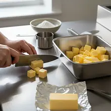 Add cold butter. Take the butter out of the fridge and cut it into small cubes (about 1x1 cm). Toss the butter cubes into the bowl with the dry ingredients. Now you need to combine the butter with the flour. You can do this in two ways: with your fingers, quickly rubbing the butter into the flour until it reaches the consistency of wet sand or crumbs, or using a pastry cutter. The key is to work quickly so that the butter doesn't warm up.