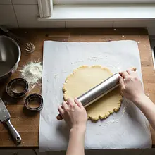Roll out the dough. Take the chilled dough out of the refrigerator. Prepare a large sheet of baking paper and lightly dust it with flour. Place the dough on it, dust the top as well, and cover it with a second sheet of paper. Roll the dough into a flat disc with a consistent thickness of about 4 mm. Rolling between two sheets of paper prevents sticking and eliminates the need to add a large amount of flour.