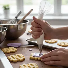 Get ready to decorate. Transfer the prepared icing into a piping bag with a small round tip (nib) with a diameter of about 1-2 mm. If you don't have a piping bag, you can use a sturdy ziplock bag with a tiny corner cut off. Prepare all the cooled cookies on a flat surface, e.g., on a baking sheet lined with parchment paper.