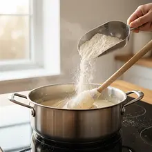 Zdejmij garnek z ognia. Do gorącego kremu dodaj 50 g zimnego masła pokrojonego w kostkę. Mieszaj, aż masło całkowicie się rozpuści i połączy z kremem, nadając mu dodatkowej gładkości i połysku.