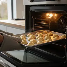 Wstaw blachy do nagrzanego piekarnika. Piecz przez pierwsze 15 minut w temperaturze 200°C (termoobieg). Następnie, nie otwierając drzwiczek piekarnika, zmniejsz temperaturę do 170°C i piecz przez kolejne 15-20 minut. Ptysie powinny być mocno wyrośnięte, złocistobrązowe i suche. Po upieczeniu wyłącz piekarnik, uchyl lekko drzwiczki i pozostaw ptysie w środku na 10 minut do przestudzenia. Następnie wyjmij je na kratkę i wystudź całkowicie.