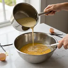 Z gorącego mleka wyjmij laskę wanilii. Bardzo powoli, cienką strużką, wlewaj gorące mleko do masy jajecznej, jednocześnie bez przerwy i energicznie mieszając trzepaczką. Ten proces nazywa się 'hartowaniem' żółtek i zapobiega ich ścięciu. Wlej w ten sposób około połowy mleka, a następnie przelej zahartowaną masę jajeczną z powrotem do garnka z resztą mleka.