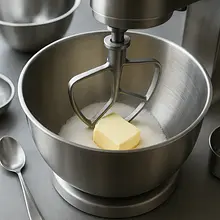 In a large mixing bowl, place the soft butter and fine sugar. Using the paddle attachment, start mixing on medium speed. Beat the mixture for about 8-10 minutes. The finished mixture should be very light, almost white, and very fluffy, and its volume should increase significantly. The sugar must be completely dissolved. Then, without stopping the mixer (reduce the speed to minimum), add the egg yolks one at a time. Only add the next yolk when the previous one is fully incorporated into the mixture. Finally, pour in the grated lemon zest and 2 tablespoons of lemon juice. Mix only until the ingredients are combined.