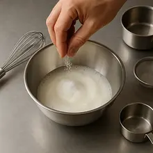 In a clean and dry bowl containing the egg whites, add a pinch of salt. Using clean and dry mixer beaters, start beating the egg whites on low speed. When they begin to foam and turn white, increase the mixer speed to maximum. Beat until the foam becomes very thick, shiny, and stiff. Properly whipped egg whites should not fall out of the bowl when turned upside down. After removing the beaters from the foam, stiff, standing "peaks" should remain on them.