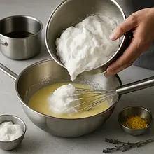 Now comes the most delicate moment. Transfer 1/3 of the whipped egg whites to the bowl with the lemon mixture. Using a large silicone spatula, very gently combine the egg whites with the batter. Make sweeping motions from the bottom of the bowl upwards, while also rotating the bowl. The goal is to lose as little air from the egg whites as possible. Once the first portion of egg whites is roughly incorporated, add the second and repeat the process, then the last. Mix only until there are no visible white streaks of egg whites. The finished batter will be very fluffy.