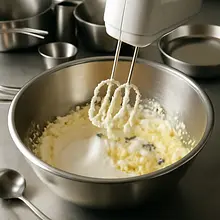 Beat the butter with sugar: place the soft butter (150 g) and sugar (200 g) in a large bowl. Use a mixer with a mixing attachment (spatula) or a hand mixer. First, mix on low speed to lightly incorporate the sugar into the butter (20–30 s), then increase the speed and beat for 3–4 minutes until the mixture becomes lighter, fluffy, and slightly creamy. The mixture should have a clearly aerated structure; when you scrape the edge of the bowl with a spoon, the surface should slowly level out.