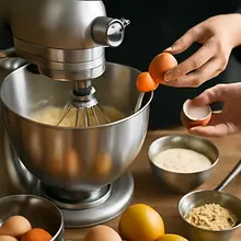 Add the eggs one at a time: reduce the mixer speed to low and add one egg at a time (a total of 4) — after each addition, mix for 20–30 seconds until fully combined. If the mixture starts to look curdled (small lumps), add 1 tablespoon of flour and mix briefly; the mixture should regain its smoothness.