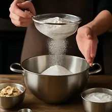 Sift the flour (300 g) with the baking powder (12 g) and salt (2 g) into a large bowl. In three portions, add the dry ingredients to the wet mixture: add the first portion and mix briefly, then the second — mixing slowly and briefly, and finally the third portion along with the milk (60 ml) and gently mix with a spatula or on the lowest mixer speed until well combined. The batter should be smooth, thick, and pourable — if it is too thick, add a maximum of 1–2 tablespoons of milk.