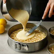 A light, fluffy cake with a distinct, fresh citrus aroma, enriched with the creamy texture of Greek yogurt and a delicate almond crumble. This is my own version of the classic lemon cake — the batter is moister thanks to the yogurt and a bit of oil, and a thin layer of lemon-lime syrup seeps into the soft crumb after baking, enhancing the freshness of the flavor. The cake is perfect as a dessert for afternoon coffee, a light breakfast cake for a Sunday gathering, or as an elegant treat for a party. Visually, it presents as a golden, slightly cracked top with a shimmering glaze and a crunchy almond topping.