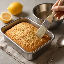 When the cake is still slightly warm (not hot), lightly soak it with the prepared syrup using a pastry brush: apply in portions so that the syrup evenly penetrates the cake. Set the cake on a rack to allow the syrup to absorb (10–15 minutes). Then prepare the glaze: sift 100 g of powdered sugar into a bowl and add 1–2 tablespoons of lemon juice (15–30 ml) and 1 teaspoon of milk (5–10 ml) — mix with a spoon until you achieve a thick but pourable consistency. Drizzle the glaze over the top of the cake.