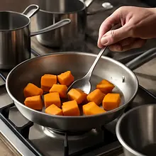 Two methods for preparing pumpkin (choose one): A) Baking (more aromatic): spread the pumpkin pieces on a baking sheet lined with parchment paper in a single layer. Drizzle with 5-10 g of oil or spread 15 g of melted butter (if using). Bake for 25-30 minutes at 200°C until the edges are slightly golden and a fork easily pierces the pumpkin. After baking, let it rest for 5 minutes. B) Boiling (quicker, gentler): place the pieces in a pot, cover the bottom with vegetable broth (about 150-200 ml), and cook covered over medium heat for 15-20 minutes from the moment it boils until the pumpkin is very soft (a fork goes in easily). Drain, reserving some cooking liquid to adjust the consistency.
