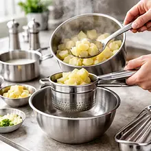 When the potatoes are soft, quickly drain them in a colander. Transfer the drained potatoes back to the warm pot and place it over very low heat without a lid for 1-2 minutes, gently stirring with a wooden spoon — the goal is to evaporate excess moisture, not to fry.