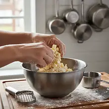 Add 200g of very cold butter, cut into small cubes, to a bowl. Using your fingertips, quickly rub the butter into the flour until you achieve fine crumbs resembling wet sand. Try to do this as quickly as possible to prevent the butter from warming up from the heat of your hands.