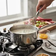 When the milk in the saucepan is hot, remove the vanilla bean. Then, while continuously stirring the milk with a whisk, pour in the egg yolk mixture in a thin stream. Cook over low heat, constantly and vigorously stirring, until the pudding thickens and the first bubbles appear. This will take about 1-2 minutes. Remove from heat and set aside to cool slightly.