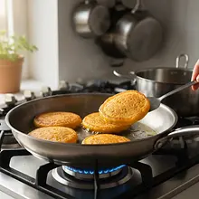 Fry the pancakes from the first side. Cook them over medium heat for about 2-3 minutes. Do not move them during this time. You will know they are ready to flip when small air bubbles appear on their surface and the edges start to look set and dull.