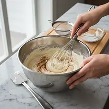 Add the sifted flour mixture to the egg mixture in three batches. After each batch, gently fold the mixture using a large silicone spatula. Make movements from the bottom to the top, scooping the mixture from the bottom of the bowl and folding it over the top. Do this slowly and carefully to minimize the deflation of the egg whites. Mix only until no dry flour is visible.