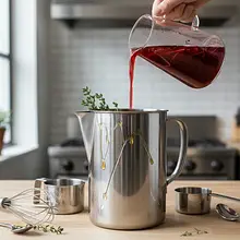 Refreshing, homemade lemonade with a beautiful pink hue that embodies the essence of early summer. This drink combines the tartness of seasonal rhubarb, the sweetness of natural honey, a subtle floral note of lavender, and a herbal hint of fresh thyme. The origin of lemonade as a beverage dates back to medieval Egypt, but this version is a modern interpretation of the classic, utilizing the treasures of European gardens. The perfectly balanced flavor – sweet, sour, and aromatic – makes it an excellent choice for hot days, garden parties, or picnics. Visually, it delights with its pastel color, and served in a glass pitcher with lemon slices and sprigs of thyme, it becomes a true centerpiece on the table. It can be enjoyed on its own or as a base for summer cocktails.
