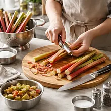 Prepare the rhubarb: trim the tough ends, peel any fibrous parts if present, and then cut the stalks into centimeter pieces. In a wide saucepan, place the chopped rhubarb, 150 g of sugar, and 200 ml of water. Add grated ginger (8 g) and 15 ml of lemon juice (from the reserved juice). Heat over medium heat until the syrup begins to gently bubble, then reduce the heat and cook uncovered for 12–15 minutes, stirring occasionally with a wooden spoon — the rhubarb should break down and release an intense pink-red juice.