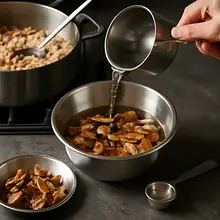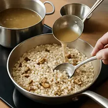 Add the hot broth ladle by ladle (about 100–150 ml at a time). After each addition, stir the rice vigorously until most of the liquid is absorbed, then add another ladle. Continue for about 18–20 minutes from the moment the broth is first added. Stir frequently (every 20–30 seconds) to release the starch and achieve a creamy consistency. If you used the soaking liquid from dried mushrooms, add it as needed instead of part of the broth — this will enhance the flavor.
