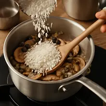 When the rice is almost al dente (after about 16–18 minutes), add the previously sautéed fresh mushrooms and gently mix in. Cook for another 2–3 minutes to allow the flavors to combine, making sure the rice doesn't become too soft.