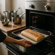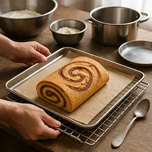 Place the tray in the preheated oven and bake for 10–12 minutes at 180°C (top-bottom). The cake is ready when the top is lightly browned and springs back when touched. Do not overbake the sponge — it should be flexible enough to roll.