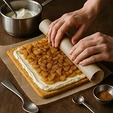 A delicate roll inspired by classic apple pie, but served in a modern, light form — a thin sponge cake rolled around aromatic, slightly caramelized apple filling and velvety mascarpone cream. When sliced, it reveals a beautiful swirl of apple filling and cream, topped with a subtle dusting of powdered sugar, chopped nuts, and optional caramel sauce. The dish combines the sweetness of caramelized apples, the vanilla softness of mascarpone, and a warm hint of cinnamon. Serve slightly chilled as a dessert with coffee, tea, or at a gathering — it delights with its appearance and contrast of textures: soft sponge, thick filling, and creamy layer inside.
