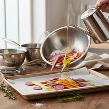 Start by preheating the oven. Set it to 200°C with the convection function or 220°C in top-bottom mode. Prepare a large baking tray by lining it with parchment paper. The paper will prevent the vegetables from sticking to the tray, and cleaning it will be much easier.