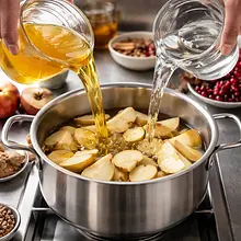 Reduce the heat to low and simmer very gently (a gentle bubbling/almost just steaming) for 15–20 minutes. After 10 minutes, check the pears with a fork — they should be soft but not falling apart (the fork should easily pierce them). The aroma of the drink should be intensely spiced and fruity.
