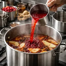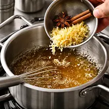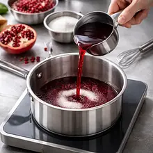 Prepare a syrup from pomegranate juice. In a medium saucepan (18-20 cm in diameter), combine 300 ml of pomegranate juice and 80 g of brown sugar. Place over medium heat and warm, stirring with a wooden spoon, until the sugar is completely dissolved (about 3-4 minutes). Increase the heat to medium-low and cook uncovered for 8-10 minutes, until the volume is reduced by about 25% and the syrup slightly thickens — after cooling, it should gently coat the spoon.