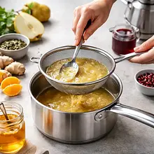 Prepare the syrup: in a medium saucepan, combine 300 ml of pomegranate juice with 100 g of brown sugar and the juice from 20 ml of lemon (we will use the remaining 40 ml from the ingredients later). Place over medium heat and warm, stirring with a wooden spoon until the sugar dissolves (~3-4 minutes). Increase the heat to medium-high and cook the mixture uncovered for 10–12 minutes, until the volume reduces by about 30% and the syrup thickens (the liquid slowly drips off the spoon, leaving a light trail). Remove from heat and let cool to room temperature.