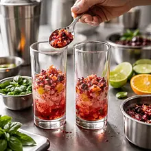 Prepare hibiscus syrup: in a pot with a capacity of about 1 liter, bring 300 ml of water to a boil. When the water reaches boiling temperature, add dried hibiscus flowers (20 g) and thinly sliced fresh ginger (30 g). Reduce the heat to low and simmer gently for 6 minutes — the petals will release a deep red color and aroma, and the ginger will add its spiciness. After 6 minutes, add 200 g of sugar and stir with a wooden spoon until the sugar completely dissolves (about 2-3 minutes). Cook for another 1-2 minutes on very low heat to achieve a slightly syrupy consistency.