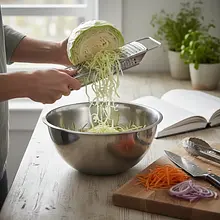 Przygotuj białą kapustę. Zdejmij zewnętrzne, ewentualnie zwiędnięte lub uszkodzone liście i wyrzuć je. Połóż kapustę na desce do krojenia i przetnij ją na pół, a następnie każdą połówkę na kolejne dwie części, uzyskując cztery ćwiartki. Z każdej ćwiartki wytnij twardy, zdrewniały głąb. Następnie każdą ćwiartkę poszatkuj bardzo cienko ostrym nożem na długie, delikatne paski. Celem jest uzyskanie jak najcieńszych wiórków. Przełóż poszatkowaną kapustę do bardzo dużej miski.