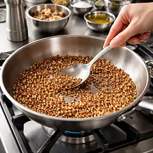 In a dry skillet (preferably cast iron or with a thick bottom), add 60 g of roasted buckwheat and toast it over medium heat for 2–3 minutes, stirring constantly, until it starts to smell nutty and lightly crackle. Transfer to a bowl. In the same skillet (if dry), add 30 g of sesame seeds and toast for 1–2 minutes until they turn golden and release a strong aroma; remove from the skillet before they start to darken.